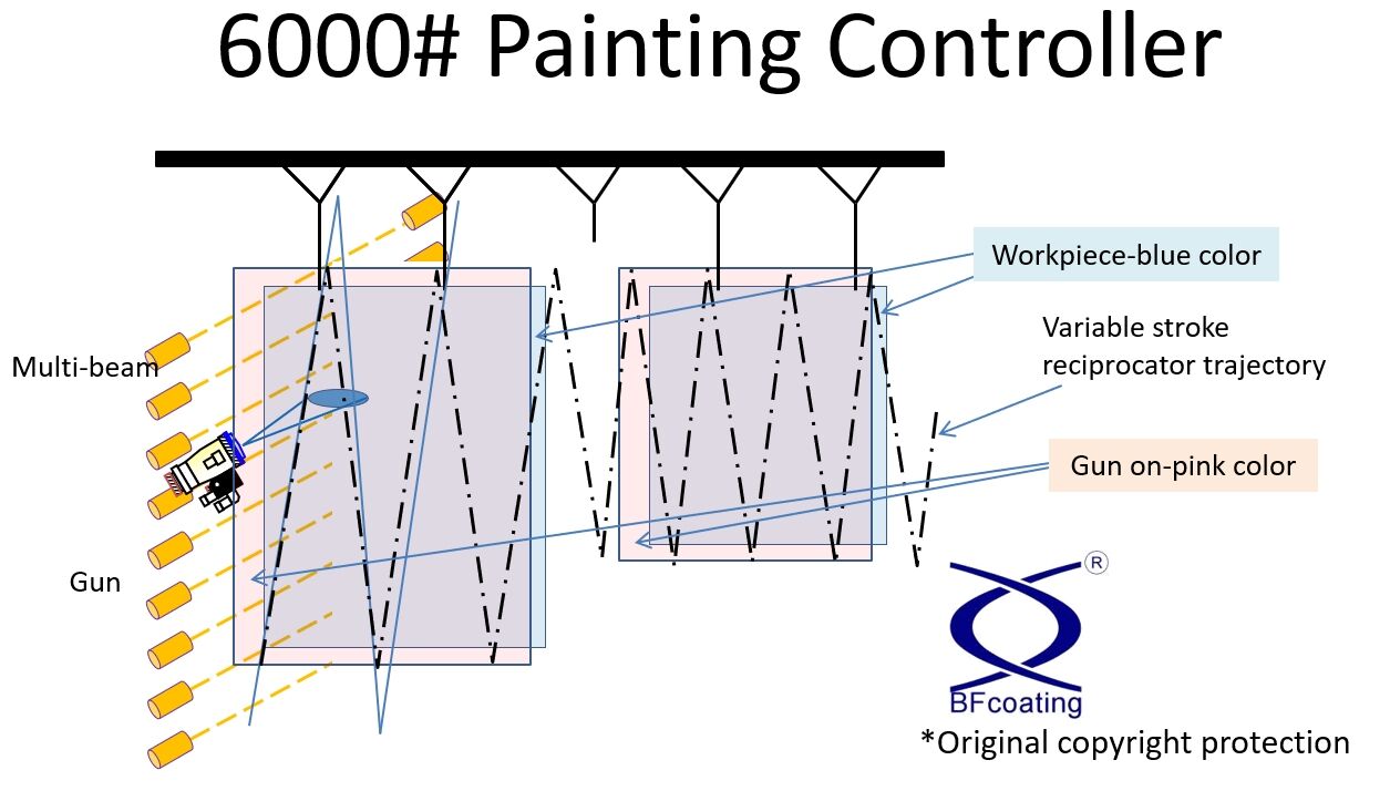 4. With the reciprocator spraying, the light curtain detect the workpiece, and with the computer's two-dimensional optimal parameter setting , the spray gun automatically turns ON/OFF for spraying, saving paint.
