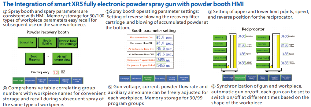 - One-key switch dual electrostatic charging mode system; Invention patent "Zone Power Auto Control" with constant current spraying Invention patent "Controllable Minimum Holding Power" -